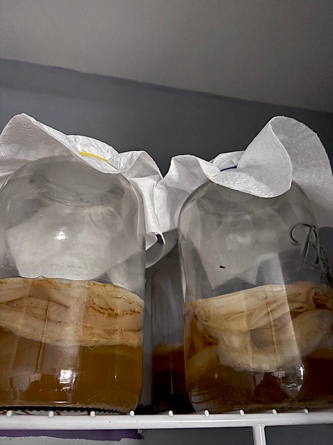 Anthony, my other half, makes kombucha, and for this I am deeply grateful. I don’t have to do anything, and kombucha shows up in my fridge. The mothers are taking over the shelf, like blobs threatening to devour our home.