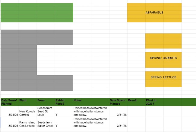 I used to keep a rather complex spreadsheet as a garden log, but now I’ve simplified with a visual version. You can see three small raised beds, an asparagus patch, a raised bed shaped like a keyhole, and the last bed in the upper left.