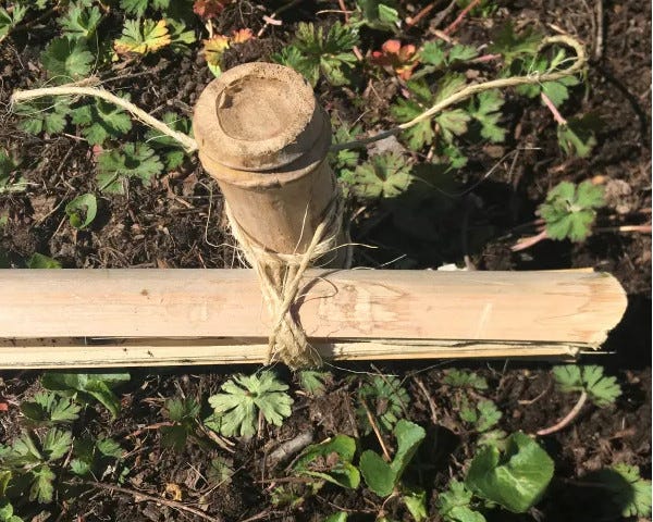 These were going to become my stakes. They were surprisingly easy to drive into the ground. Using my hand and bodyweight, I could push them 6” into the ground and then use the rubber mallet to drive them down until about 2-3” stuck up above the ground. I then lashed the base supports to the stakes with twine.