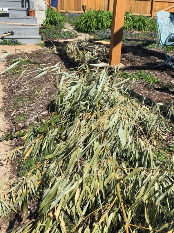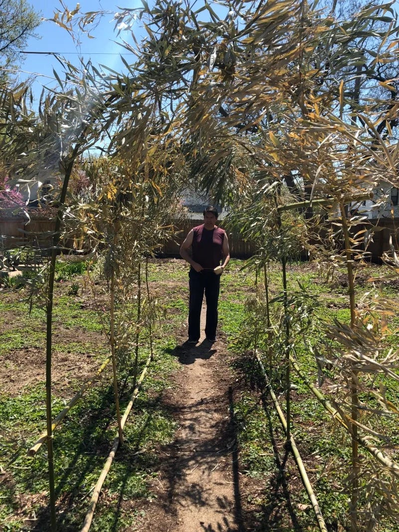 So, it is with this familial background that I announced with a casual and cavalier attitude that I would build a squash tunnel. With a limited budget, and a DIY attitude, we decided to forego purchasing in favor of building. Lisa and I were out for a walk, and we passed by one of our neighbors, who has a large grove of bamboo growing on the side of his property. Bamboo grows really fast. So, he has to cut it back a couple of times a year. He just has the city come and pick it up as yard waste. We'd already snagged a few of his excess bamboo canes previously, using them as tree stakes. And then the light went on—bamboo is great building material! He has all kinds of lengths and thicknesses. Well, talk about your win-win. He was thrilled to have us haul away all of his bamboo, and we got free building material.
