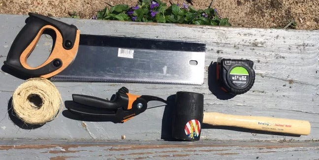 Saw, tape measure, twine, hand cutters, and a rubber mallet.