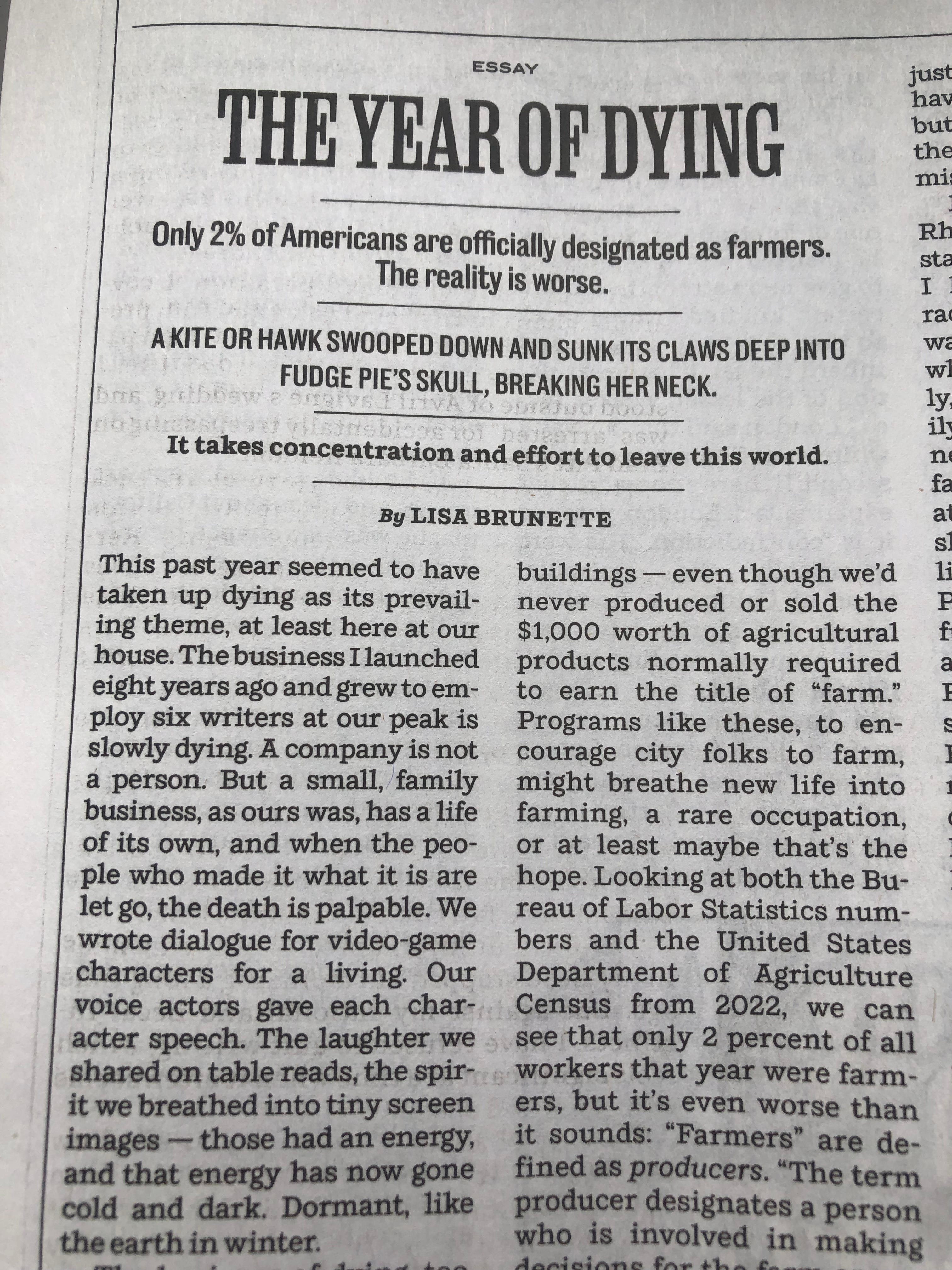 This past year seemed to have taken up dying as its prevailing theme, at least here at our house. The business I launched eight years ago and grew to employ six writers at our peak is slowly dying. A company is not a person. But a small, family business, as ours was, has a life of its own, and when the people who made it what it is are let go, the death is palpable. We wrote dialogue for video-game characters for a living. Our voice actors gave each character speech. The laughter we shared on table reads, the spirit we breathed into tiny screen images—those had an energy, and that energy has now gone cold and dark. Dormant, like the earth in winter.